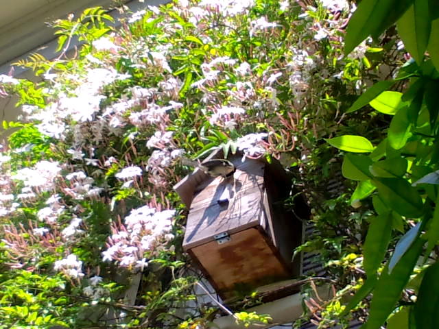 階ベランダのジャスミン絡まるド派手な巣箱に親鳥が入ったのが4月のは