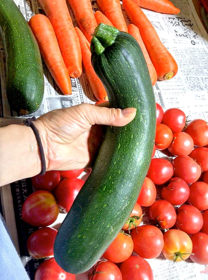 例の八百屋での本日の収穫は、特大キュウリ24本+ナス19本、各250円、