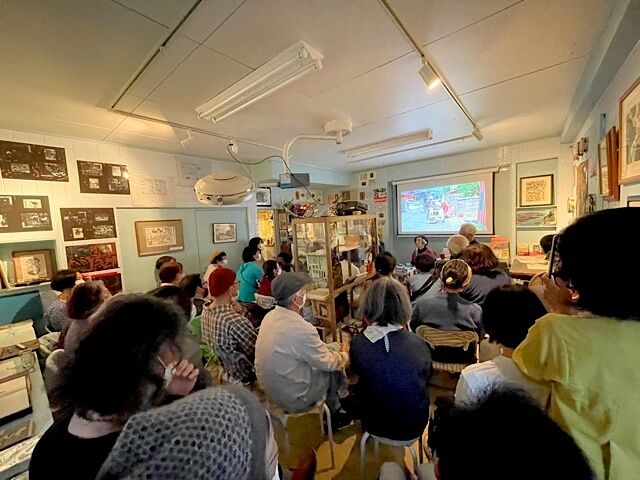 Operation Tableで開催していた山福朱実の版画と記録「山福印刷と樹の実工房」は一昨日、末森樹・山福朱実ライブと、上野朱・山福緑・山福朱実トークのイベントをもって終了しました。ライブでは、この展覧会の由来となった、JT生命誌研究館の記録映画『食草園が誘う昆虫と植物のかけひきの妙』の案内チラシに詩人のぱく・きょんみさんが寄せた讃「わからなくてもいいい」を末森樹さんが曲にしたものが披露されました。もちろん歌うのは朱実さん。山福印刷が筑豊/九州文学の拠点でもあったことから「炭坑節」「無法松の一生」も出ました。思わず会場から手拍子が出る、緑さんも合いの手を入れるでにぎやかなライブでした。上野朱さんと緑さん+朱実さんの掛け合いトークでは、山福印刷67年のとりどりな逸話、印刷機導入と解体の秘話が語られました。なごやかな空気のうちに超満員の会場が閉じられました。展覧会においでいただいたみなさま、ありがとうございました。 真武真喜子